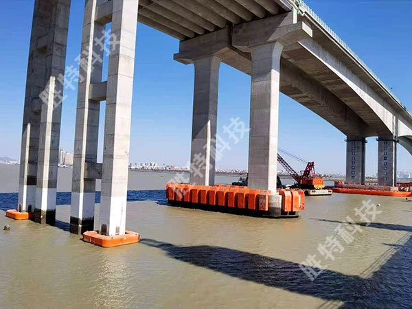 勝特公司采用自浮式鋼覆復合材料防撞設施12套,安裝在大橋橋墩四周,該防撞設施集合了目前已知防撞裝置的優點,不僅外形美觀,而且耐腐蝕性、抗衰老性、耐沖刷性極好,防撞效果也極強,可有效降低沖撞力60%以上。