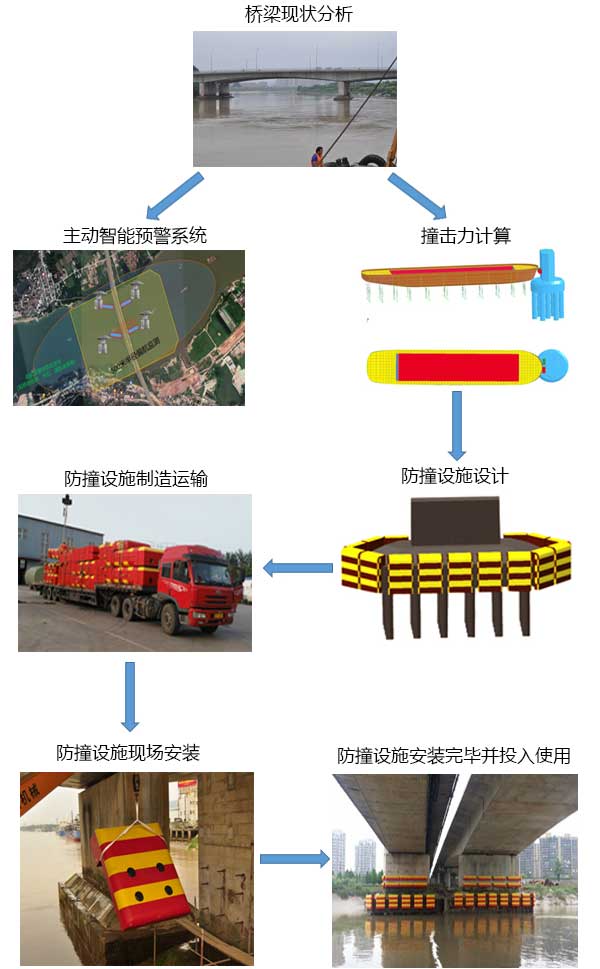 被動防撞設施,對橋梁橋墩或承臺做防撞加固,通過前面的橋梁現場分析,我們根據通航船舶的撞擊力進行模擬計算,有了準確的數據后,再進行防撞設施的設計、生產和制造,并運送到現場進行安裝,安裝完成后,通過客戶或第三方的檢驗,投入使用。